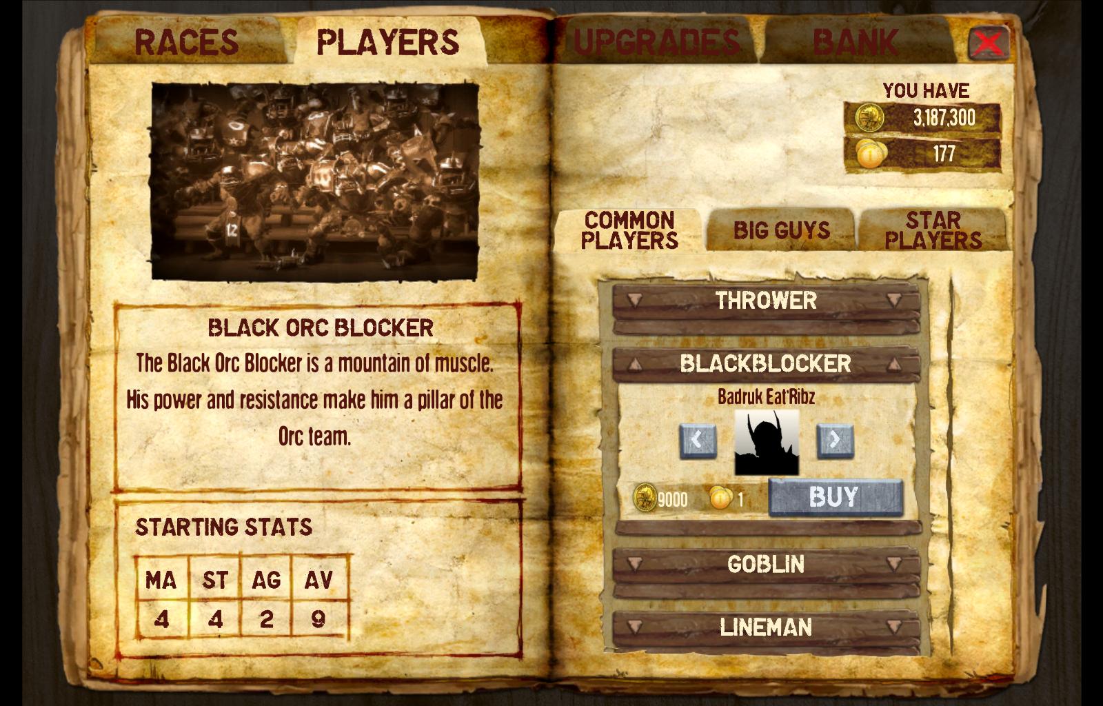 The Players page is where you buy or rent players to improve your team. The type of players you can buy or rent depends on the race of your team. There are 3 types of player: the Common Players, Big Guys ans Star Players.